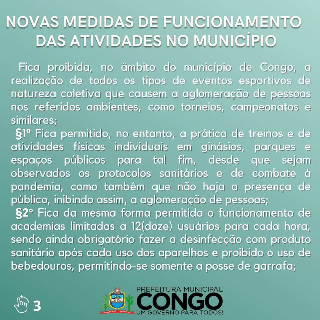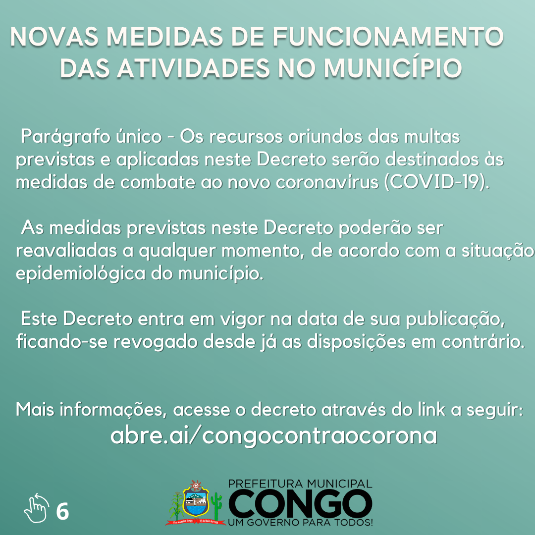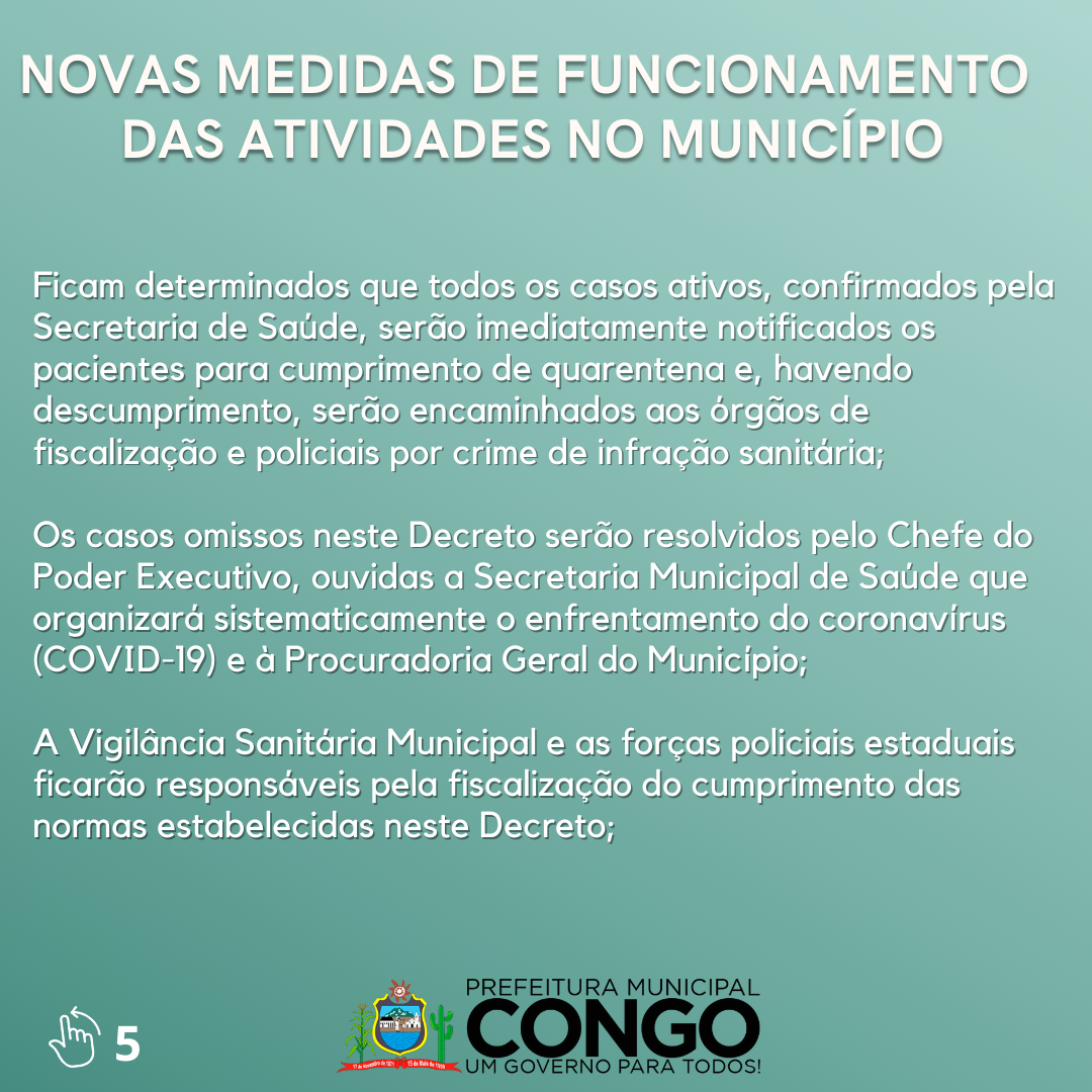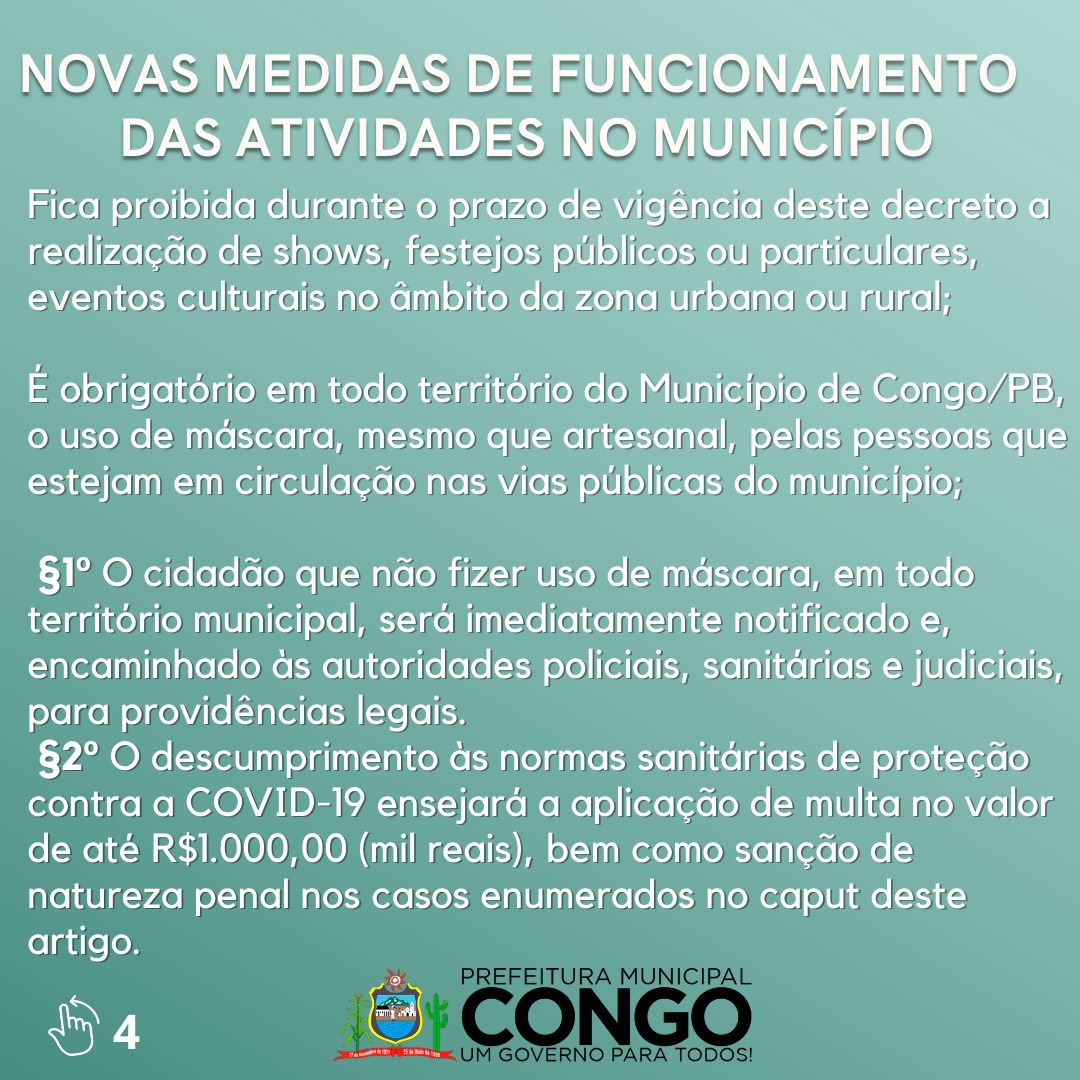 DISPÕE SOBRE MEDIDAS DE CONTROLE E PREVENÇÃO DO CONTÁGIO PELO CORONAVÍRUS (COVID-19) NO ÂMBITO DO MUNICÍPIO DE CONGO E DÁ OUTRAS PROVIDÊNCIAS.