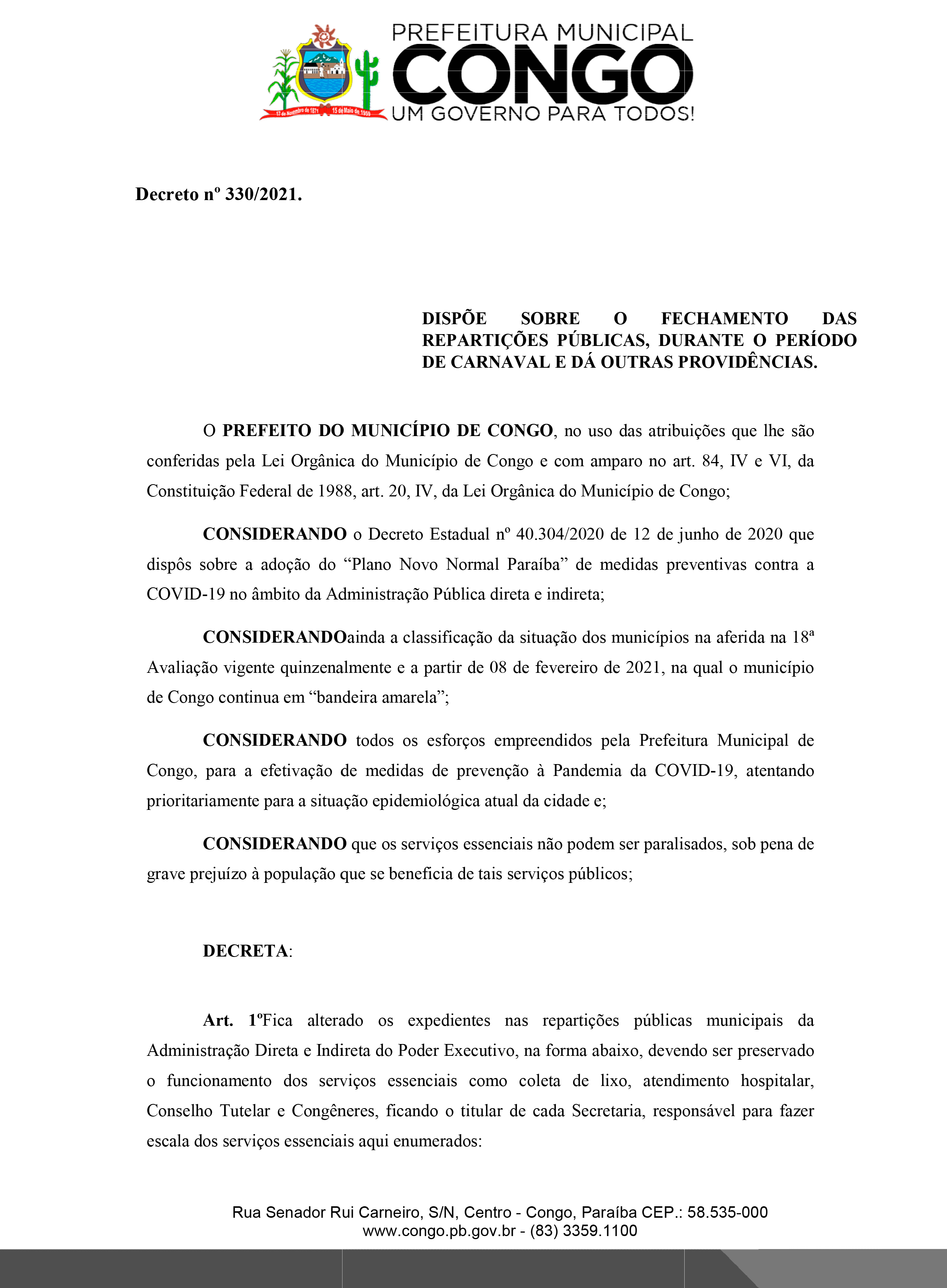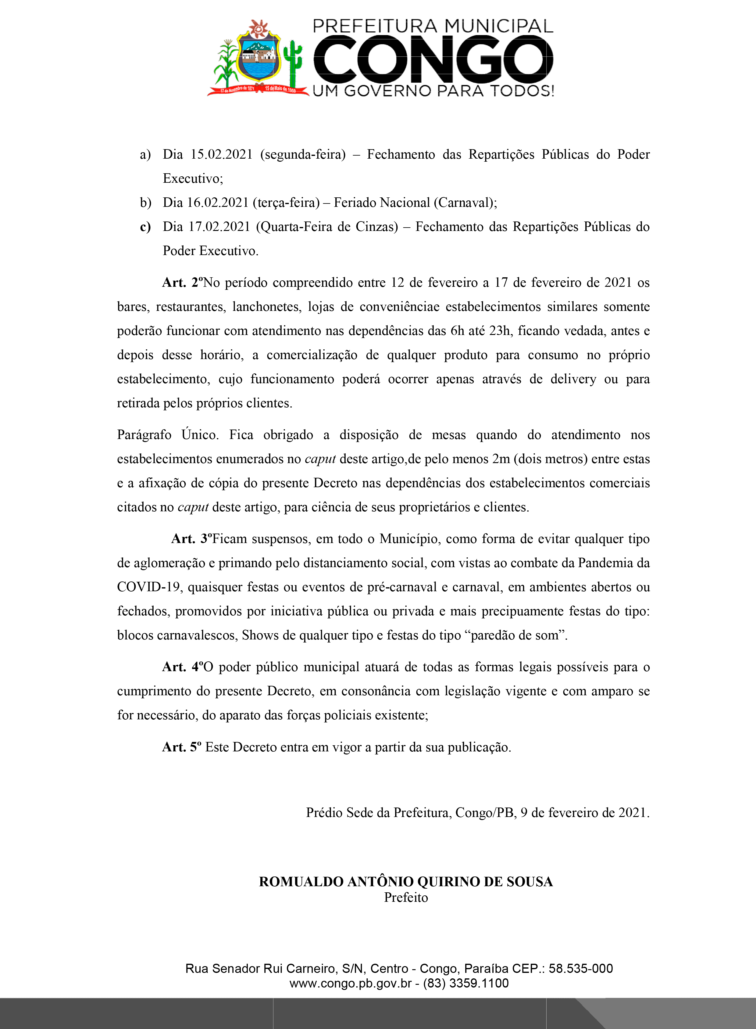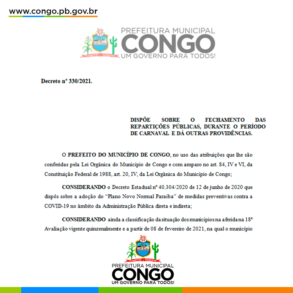 A Prefeitura Municipal de Congo publica no dia de hoje o decreto que regulamenta o funcionamento das repartições públicas, municipais e estabelecimentos comerciais durante o período do carnaval.